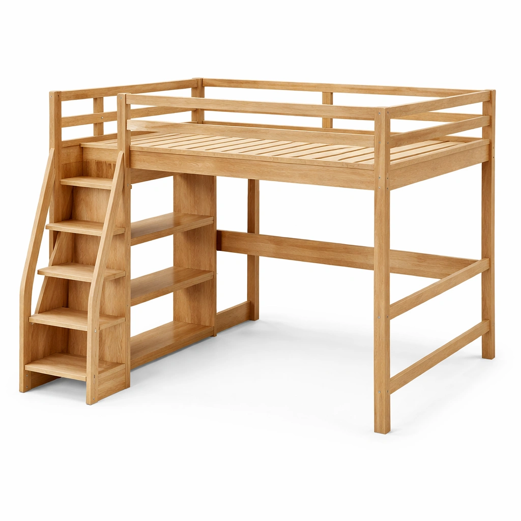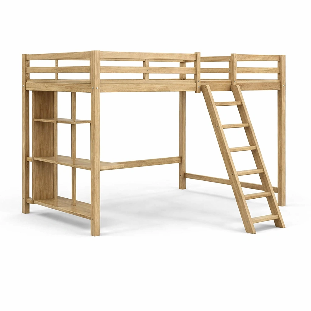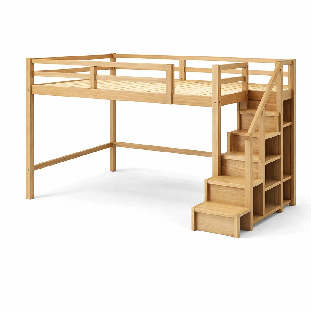 Cama alta de madera de roble con escalera y almacenamiento
